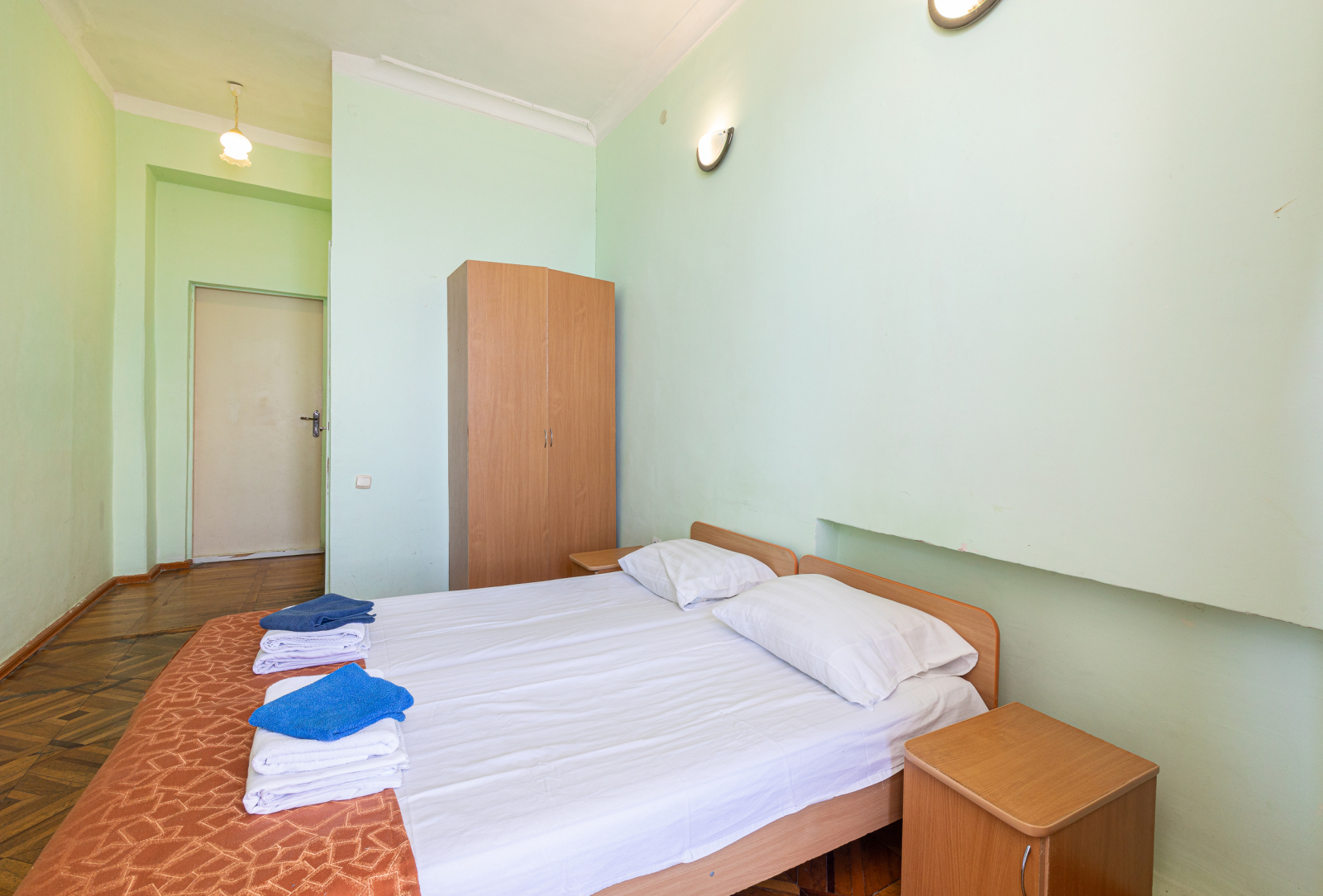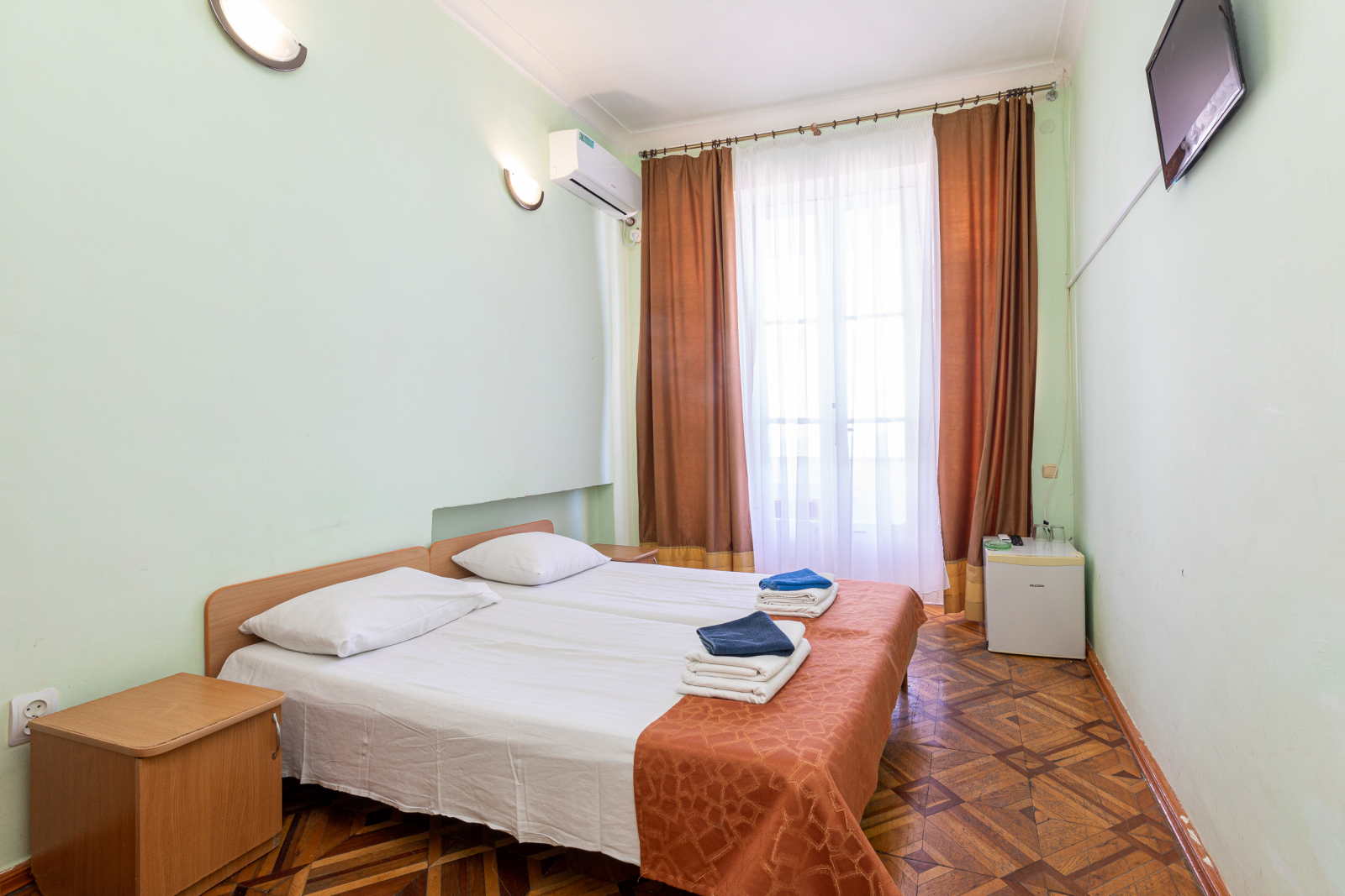 Площадь номера - 16 кв.м. 2 осн. места. 1 доп. место. Балкон. Мебель: вешалка, зеркало, кровати односпальные /одна двуспальная кровать, прикроватные тумбочки, стулья, шкаф. Оборудование: кондиционер, микроволновая печь, телевизор. Санузел: с душем, туалетные принадлежности. Сервис: Wi-Fi бесплатно, смена полотенец, смена постельного белья, уборка номера.