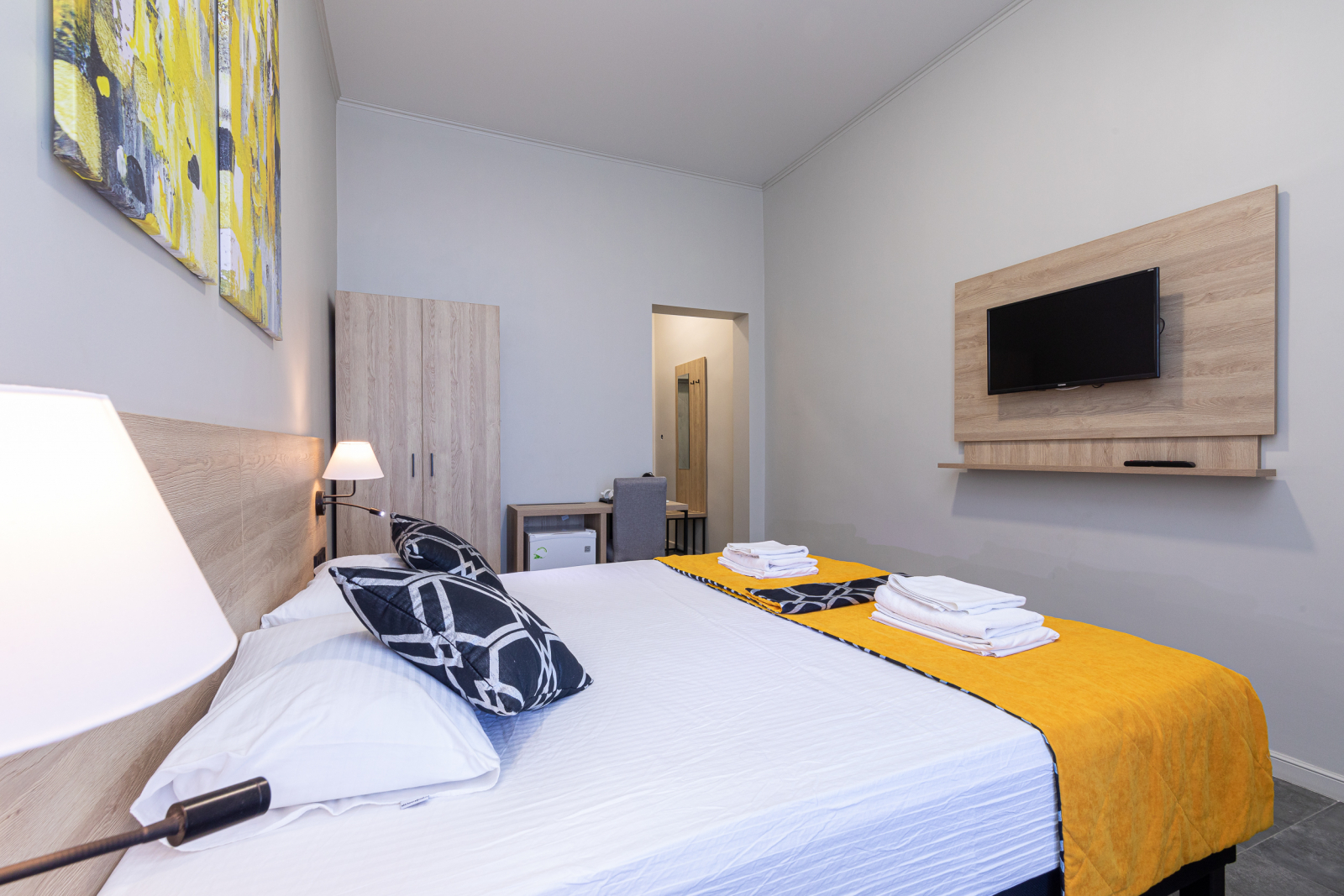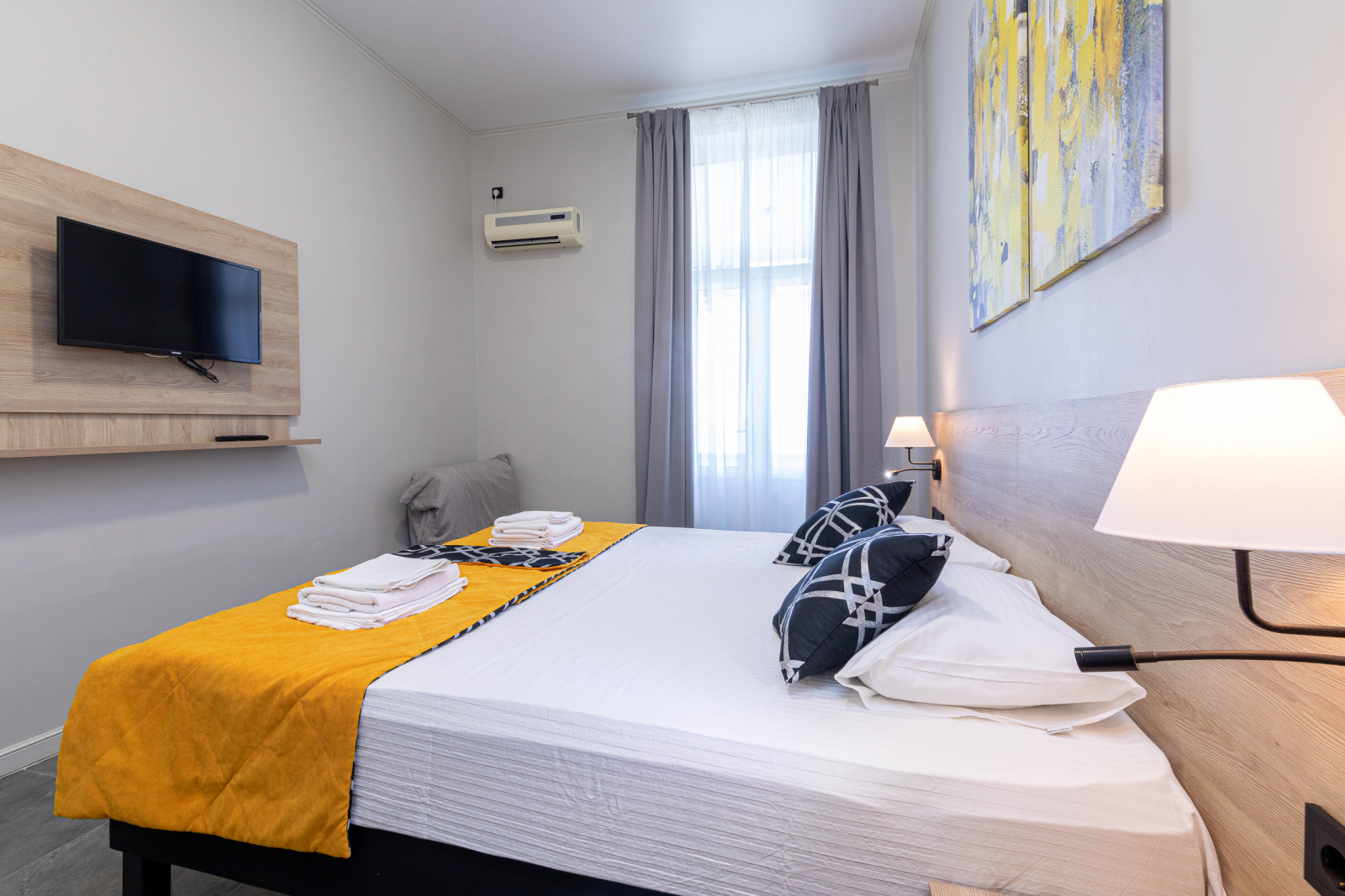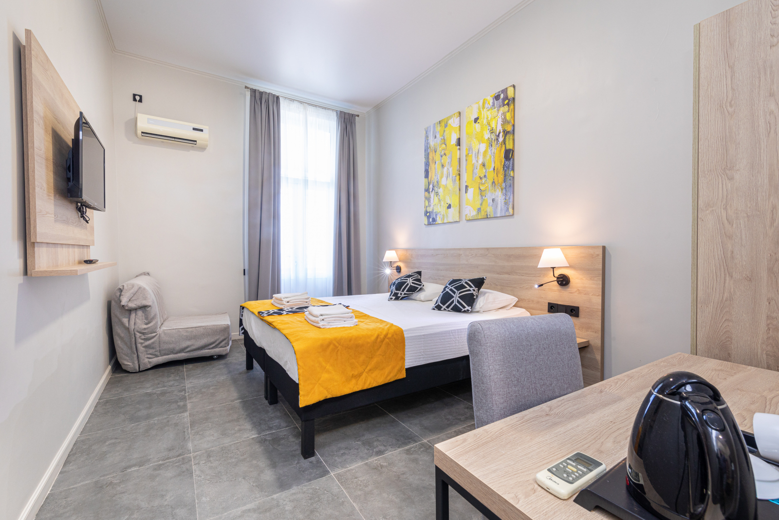 Площадь номера - 16 кв.м. 2 осн. места. 1 доп. место. Балкон. Мебель: вешалка, зеркало, кресло-кровать, кровати односпальные (2), прикроватные тумбочки, стол, стул, шкаф. Оборудование: кондиционер, мини-холодильник, телевизор. Санузел: с душем, туалетные принадлежности. Сервис: Wi-Fi бесплатно, смена полотенец, смена постельного белья, уборка номера.