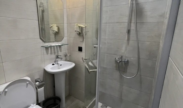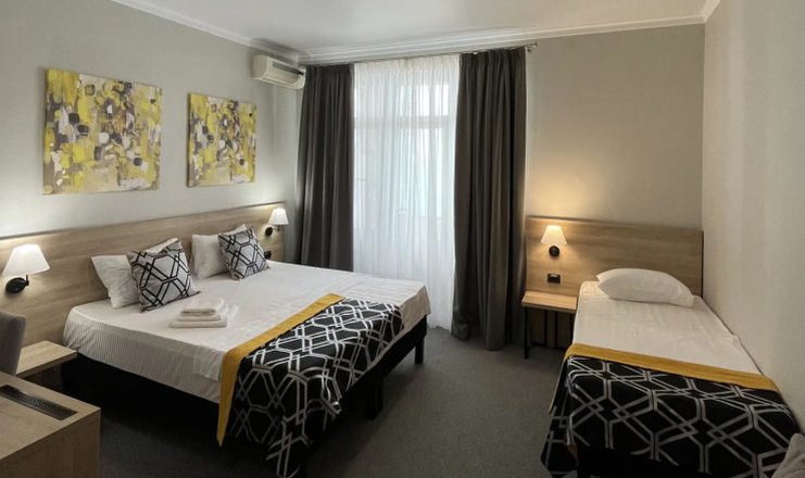 Площадь номера - 20 кв.м. 3 осн. места. 1 доп. место. Балкон. Мебель: вешалка, зеркало, кресло-кровать, кровати односпальные /одна двуспальная кровать, кровать односпальная, прикроватные тумбочки, стол, стул, шкаф. Оборудование: кондиционер, мини-холодильник, телевизор. Санузел: с душем, туалетные принадлежности. Сервис: Wi-Fi бесплатно, смена полотенец, смена постельного белья, уборка номера.