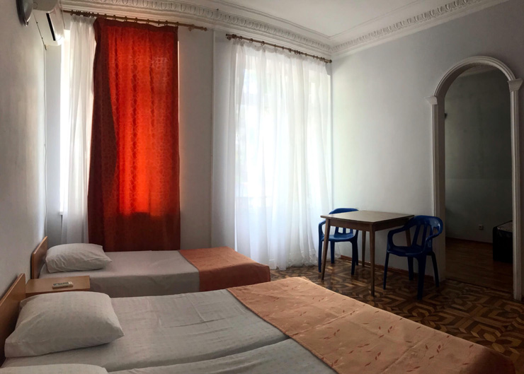 Площадь номера - 20 кв.м. 4 осн. места. 1 доп. место. Балкон. Мебель: вешалка, зеркало, кровати односпальные (4), прикроватные тумбочки, стол, стулья, шкаф. Оборудование: кондиционер, мини-холодильник, телевизор. Санузел: с душем, туалетные принадлежности. Сервис: Wi-Fi бесплатно, смена полотенец, смена постельного белья, уборка номера.