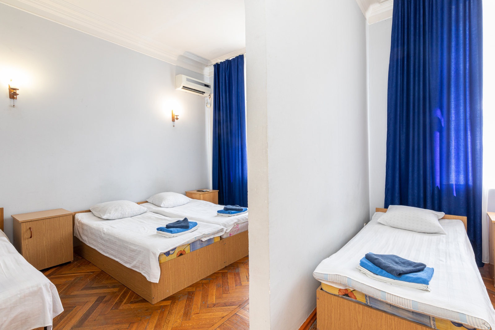 Площадь номера - 20 кв.м. 4 осн. места. 1 доп. место. Мебель: вешалка, зеркало, кровати односпальные (4), прикроватные тумбочки, стул, шкаф. Оборудование: кондиционер, мини-холодильник, телевизор, чайный набор посуды, электрочайник. Санузел: с душем, туалетные принадлежности. Сервис: Wi-Fi бесплатно, смена полотенец, смена постельного белья, уборка номера.